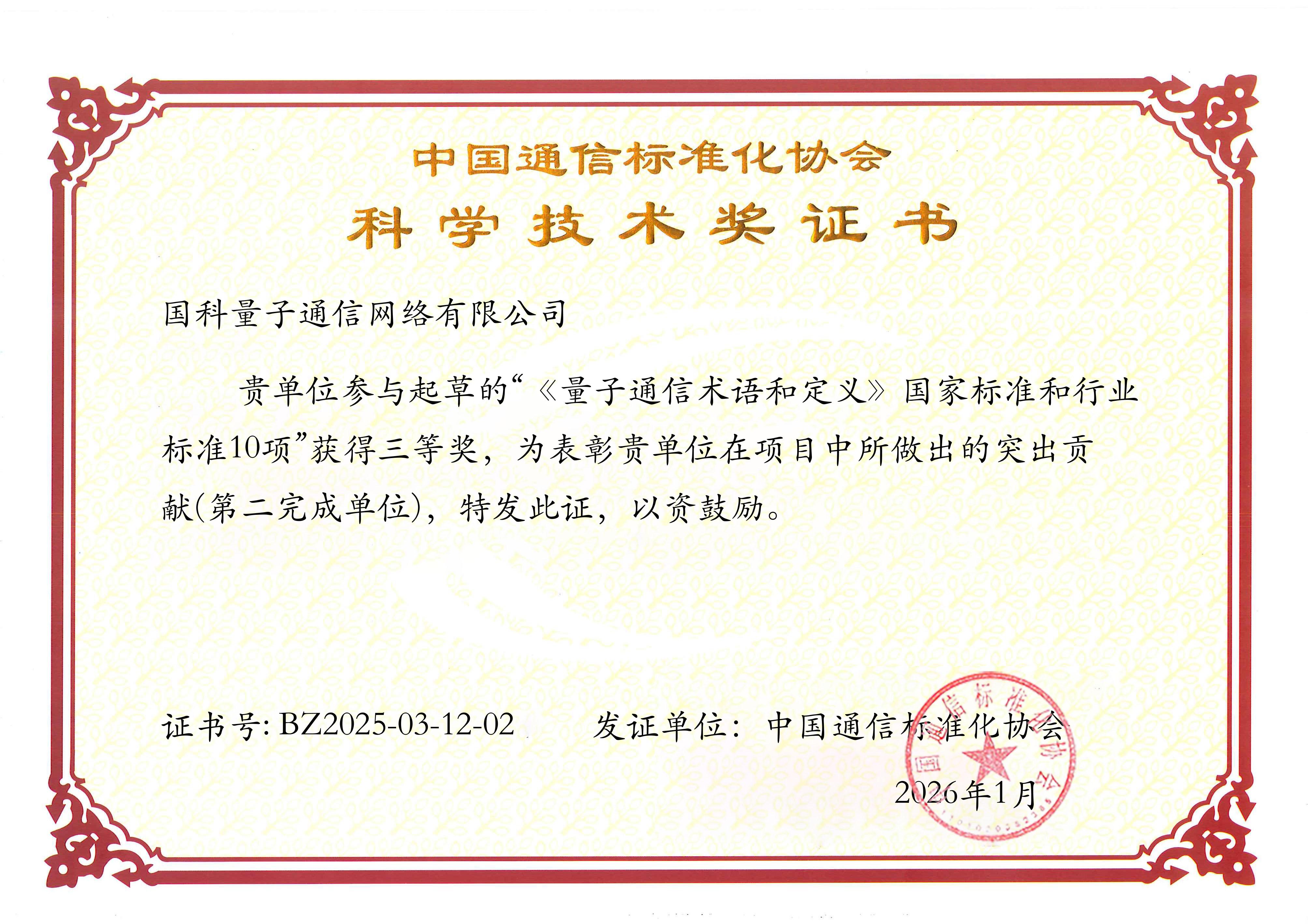2024年3月牵头制定的量子通信领域首个国家标准《量子保密通信应用基本要求》正式实施