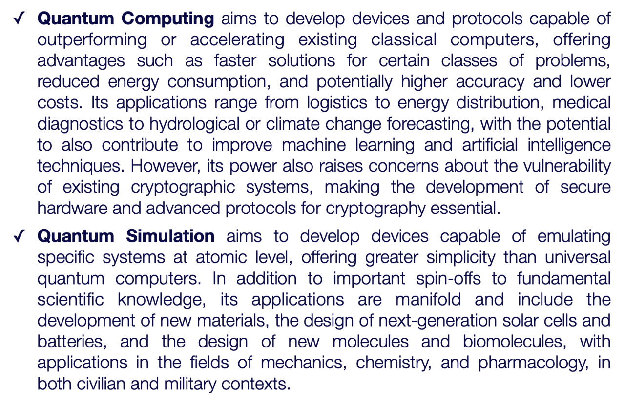 该战略围绕"科学与工业发展、国家生态构建、国际化与安全、治理与可衡量性"四大支柱展开系统布局,明确了未来五年在量子计算、通信、传感等核心领域的行动路线和资金框架。意大利计划在在现有资金(2021-2024年已投入超2亿欧元)基础上,每年新增约2亿欧元公共投资,连续五年总额近10亿欧元。