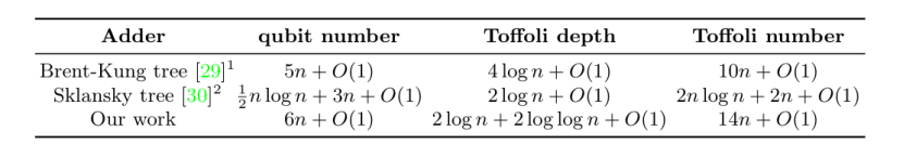 量子加法器是Shor算法中最基础也最关键的组件。椭圆曲线运算的核心是模块化算术,而加法器的性能直接决定了整个算法的资源开销。此前,行业内存在两种主流加法器:一种是Brent-Kung树加法器,虽仅需O(n)个辅助量子比特,但Toffoli深度高达4log n;另一种是Sklansky树加法器,能将深度降至2log n,却需要O(nlog n) 个辅助量子比特,这对于量子比特稀缺的硬件来说难以承受。