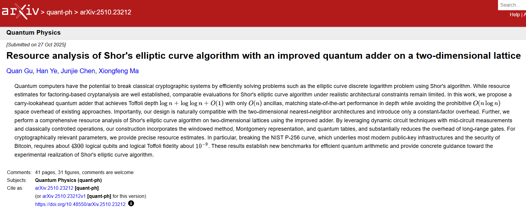 2025年10月27日,清华大学马雄峰团队在预印平台arxiv上发表题为”Resource analysis of Shor's elliptic curve algorithm with an improved quantum adder on a two-dimensional lattice”(在二维晶格上对Shor椭圆曲线算法的资源分析,采用改进的量子加法器)的研究论文,顾全、叶涵、陈俊杰为论文共同第一作者,马雄峰为论文通讯作者。