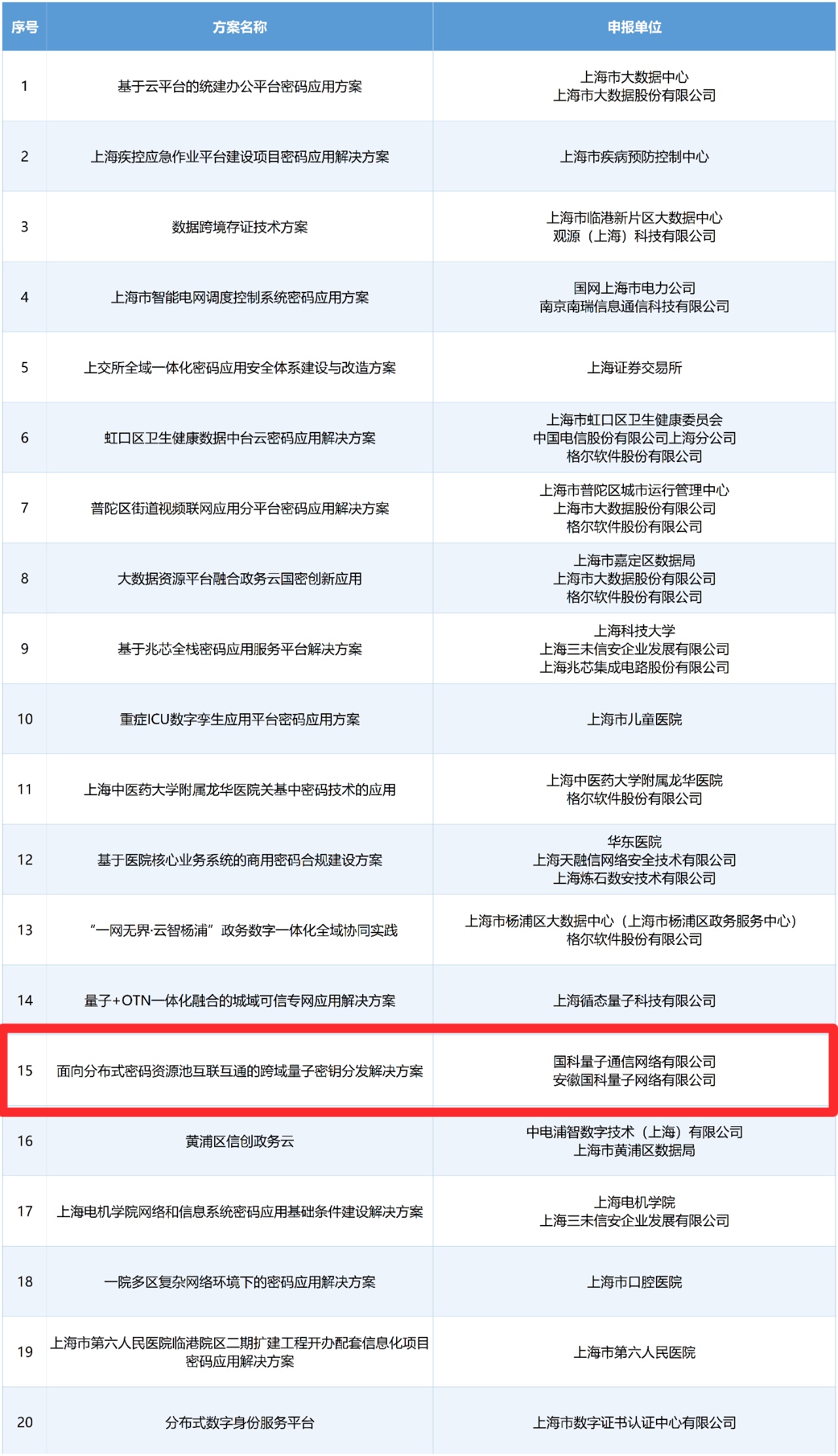 本次评选工作,专家组听取了申报牵头单位围绕方案需求分析、方案设计、方案特色、产品和服务、应用情况和密评情况等方面所作的汇报,审阅了相关技术资料,进行了提问和讨论,针对方案合规性、完整性、创新性、实效性及推广价值等五个方面进行客观专业的评选,评选出20个优秀密码应用解决方案: