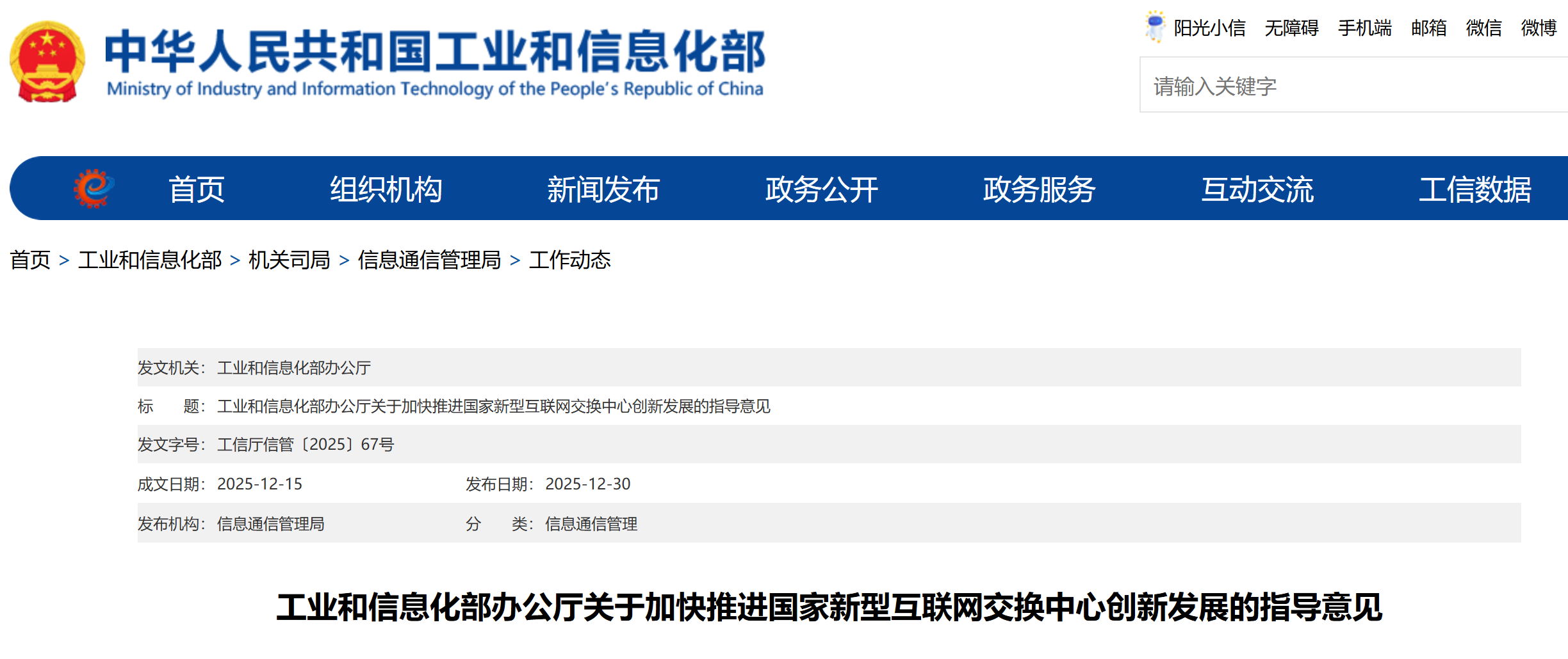 产业动态 | 发布时间:2025-12-31 | 阅读:106 次2025年12月30日,工业和信息化部发布《关于加快推进国家新型互联网交换中心创新发展的指导意见》。在“推动技术研发部署”中提出,推动量子通信等前沿技术在交换中心部署和应用,提升网络交换效率和智能化运营水平。