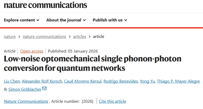 产业动态 | 发布时间:2026-01-06 | 阅读:102 次2026年1月5日,《自然·通讯》发表的《Low-noise optomechanical single phonon-photon conversion for quantum networks》一文,由代尔夫特理工大学Simon Gröblacher团队(第一作者Liu Chen)完成,标志着量子网络中跨系统信息传输的核心技术实现了里程碑式进展。这一成果解决了长期困扰量子通信的“接口兼容”难题——通过光机械系统实现单声子与单光子的低噪声转换,为构建跨平台的混合量子网络提供了可行方案。