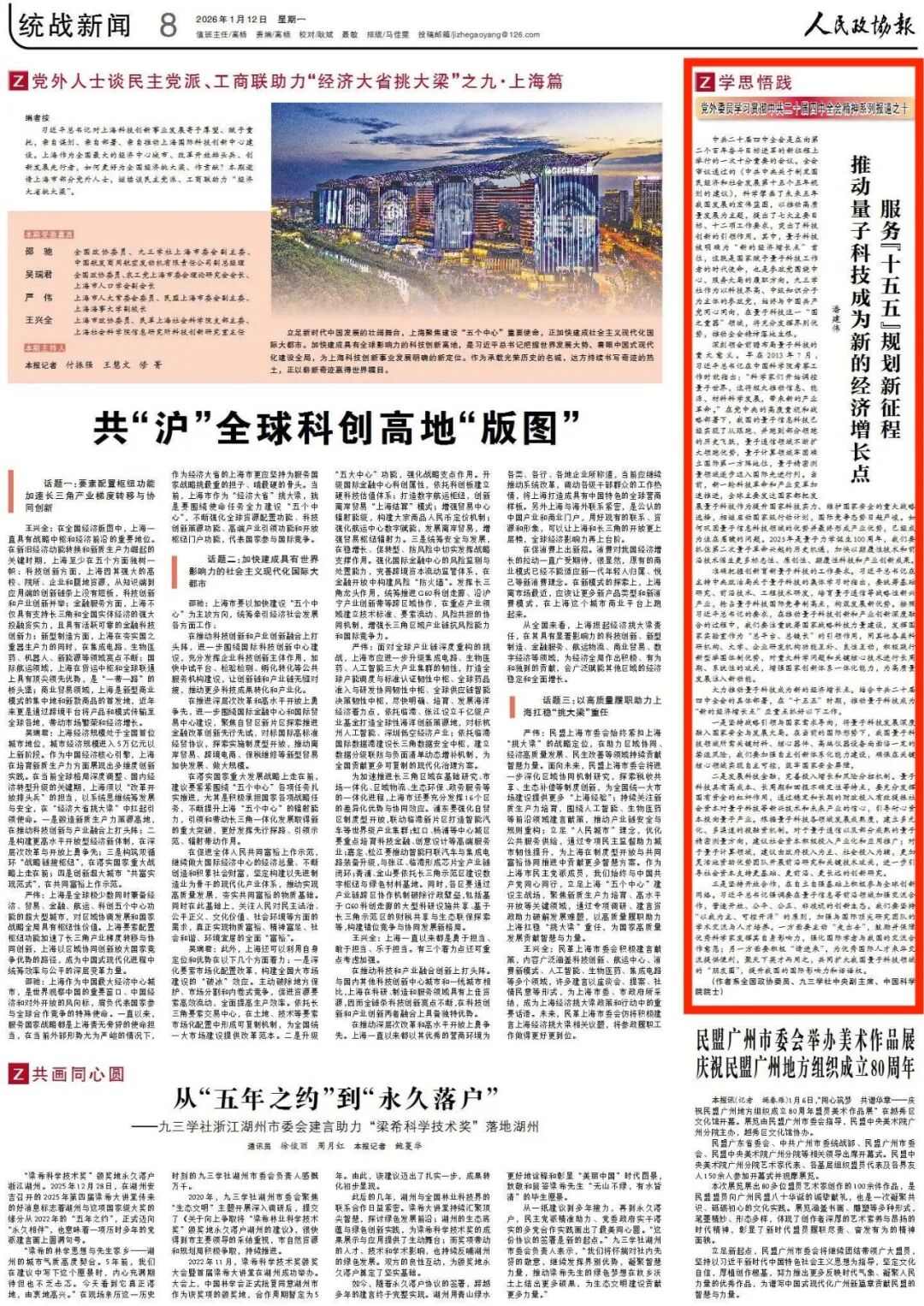 中共二十届四中全会是在向第二个百年奋斗目标进军的新征程上举行的一次十分重要的会议。全会审议通过的《中共中央关于制定国民经济和社会发展第十五个五年规划的建议》,科学擘画了未来五年我国发展的宏伟蓝图,以推动高质量发展为主题,提出了七大主要目标、十二项工作要求,突出了科技创新的引领作用。其中,量子科技被明确为“新的经济增长点”首位,这既是国家赋予量子科技工作者的时代使命,也是参政党围绕中心、服务大局的履职方向。九三学社作为以科技界高、中级知识分子为主体的参政党,始终与中国共产党同心同向,在量子科技这一“国之重器”领域,将充分发挥界别优势,推动全会精神落地生根。