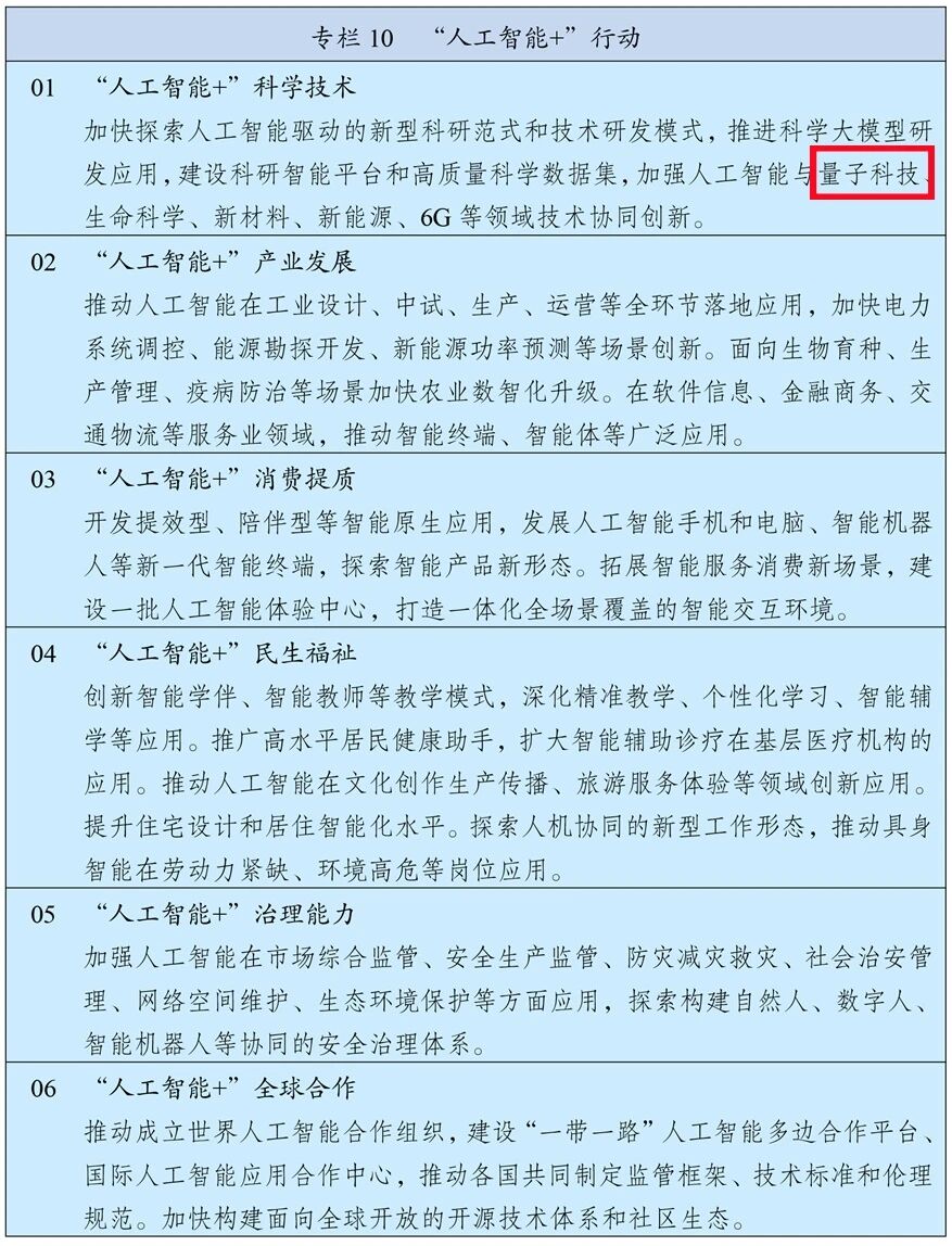在“第十三章 全方位推进数智技术赋能”“专栏10 ‘人工智能+’行动”“01 ‘人工智能+’科学技术”一栏中提出:“加强人工智能与量子科技……等领域技术协同创新。”
