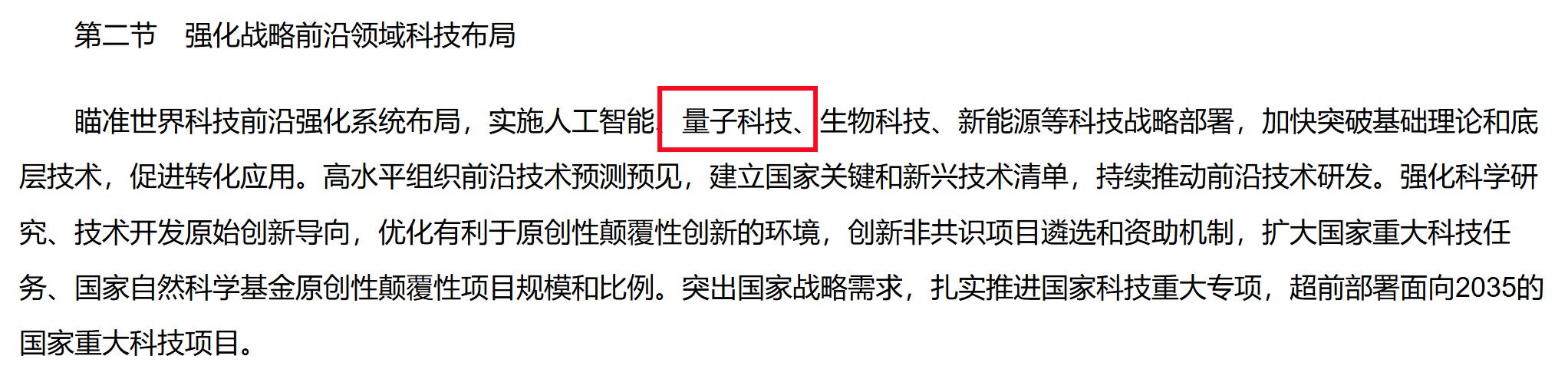 在“第八章 加强原始创新和关键核心技术攻关” “第二节 强化战略前沿领域科技布局”中提出:“瞄准世界科技前沿强化系统布局,实施人工智能、量子科技、生物科技、新能源等科技战略部署,加快突破基础理论和底层技术,促进转化应用。”