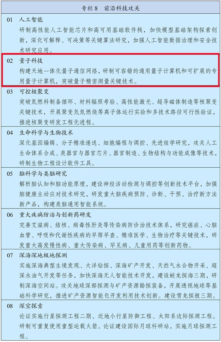 在第八章第二节“专栏8 前沿科技攻关”“02 量子科技”一栏中提出:“构建天地一体化量子通信网络,研制可容错的通用量子计算机和可扩展的专用量子计算机,突破量子精密测量关键技术。”