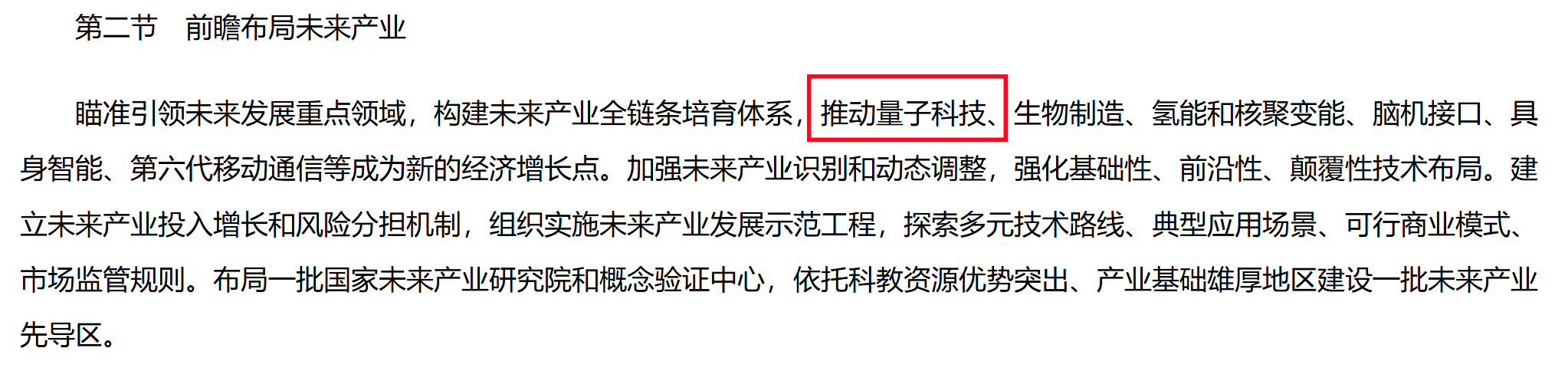 在“第五章 培育壮大新兴产业和未来产业” “第二节 前瞻布局未来产业”中提出:“瞄准引领未来发展重点领域,构建未来产业全链条培育体系,推动量子科技、生物制造、氢能和核聚变能、脑机接口、具身智能、第六代移动通信等成为新的经济增长点。”