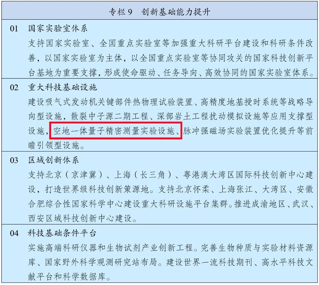 在“第九章 提高体系化创新能力”“专栏9 创新基础能力提升”“02 重大科技基础设施”一栏中提出:“建设……空地一体量子精密测量实验设施……等前瞻引领型设施。”