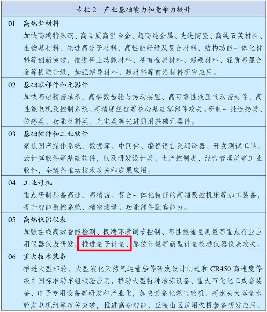 在“第四章 优化提升传统产业”“专栏2 产业基础能力和竞争力提升” “05 高端仪器仪表”一栏中提出:“推进量子计量、原位计量等新型计量校准仪器仪表攻关。”
