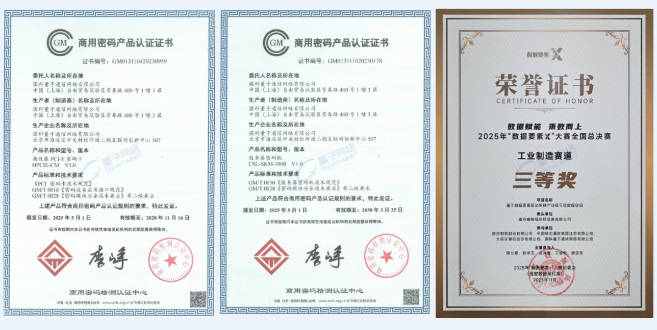 此外,国科量子还打造了链路加密设备、服务器密码机、PCI-E密码卡、证书认证系统等全系列商用密码产品,并均获得商密证书,已在金融、能源、政务、交通等行业成功应用。同时,为服务数据安全、释放数据要素价值,国科量子开展了量子可信数据空间等产品研发,努力构建可信数据流通环境,目前已在工业制造、汽摩产业、公安警务等行业开展应用,相关产品方案荣获2025年“数据要素×”大赛全国总决赛工业制造赛道三等奖等荣誉。