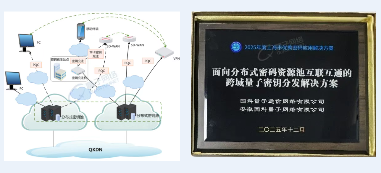 面向多用户、高并发、海量终端接入的应用场景,分布式密钥资源池基于底层量子通信网络能力,可实现百万级用户接入、万级业务并发的密钥服务能力。该系统同时支持QKD、后量子密码算法(Post-Quantum Cryptography, PQC)、密钥分量、充注等多种服务方式,并且能够严格隔离不同业务和用户的密钥资源,实现精细化的密钥全生命周期管理,有力支撑量子通信的规模化应用。相关产品和方案荣获“2025年度上海市优秀密码应用解决方案”。
